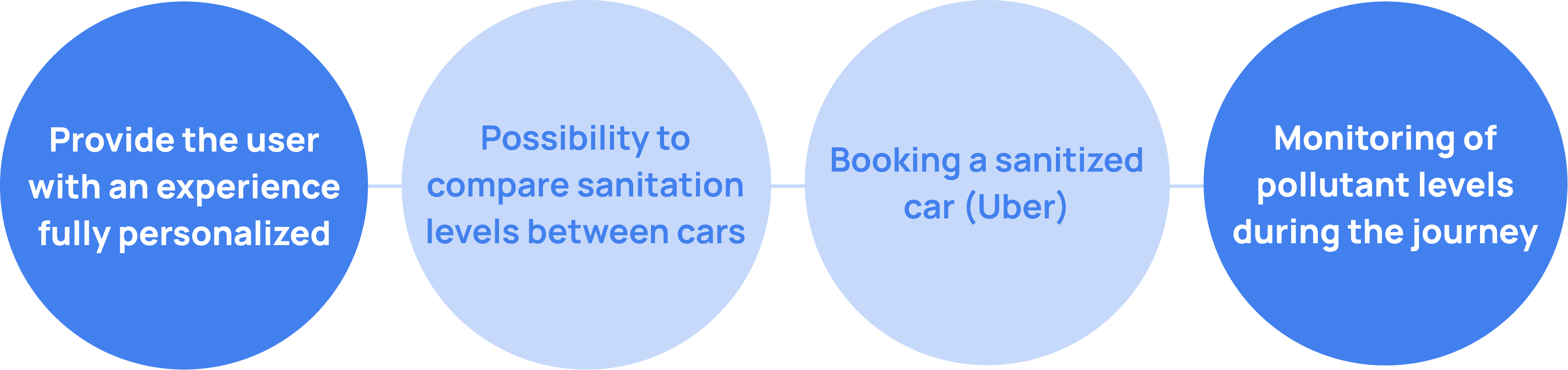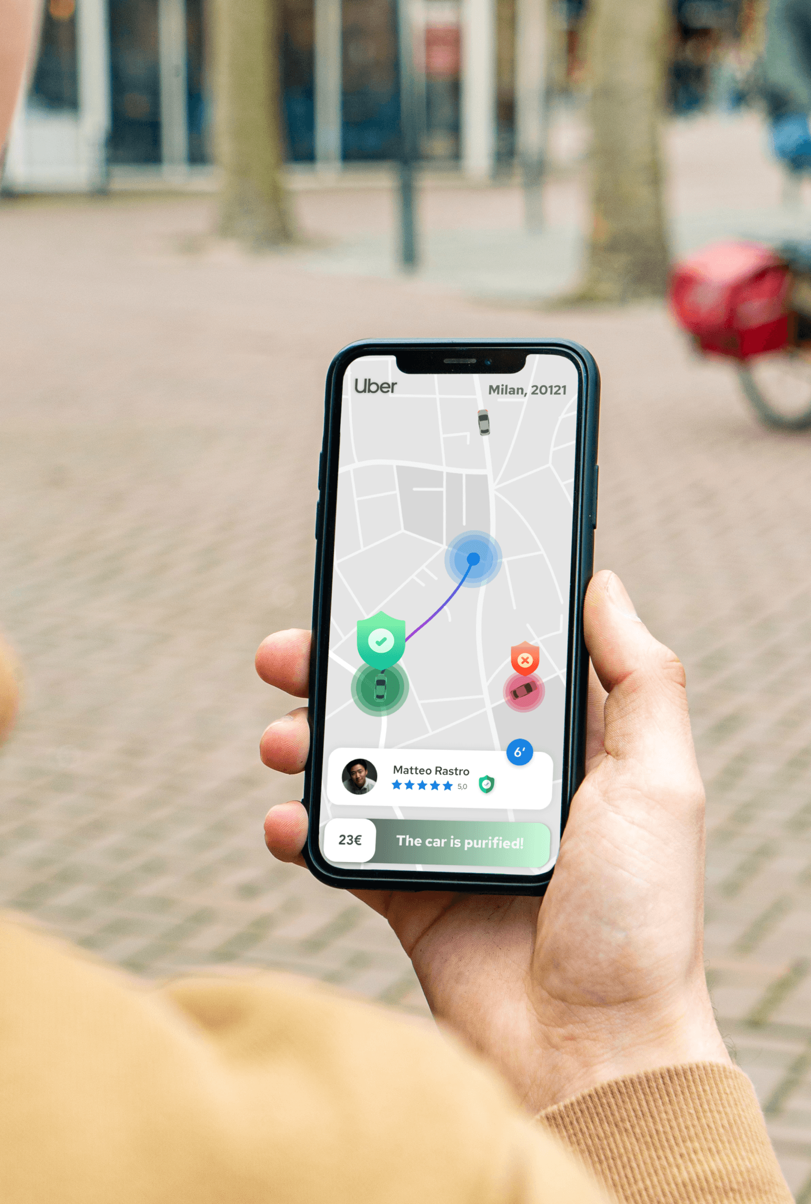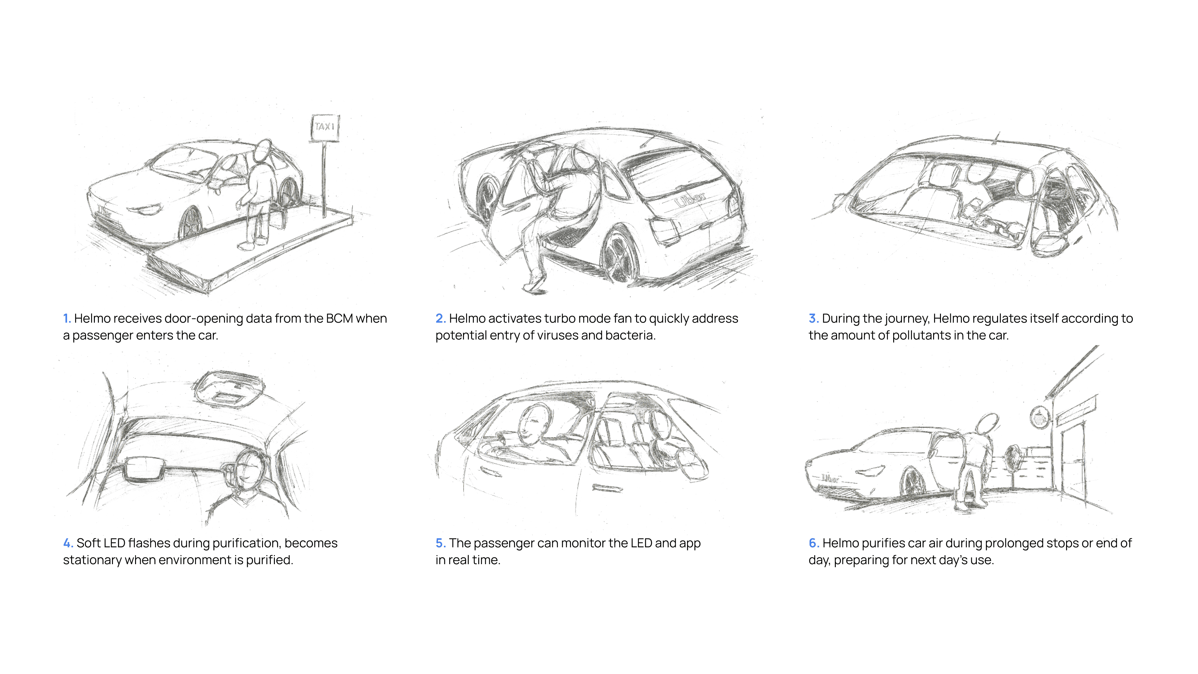 The project introduces a service that revolutionizes shared mobility. Users, guaranteed to always travel in sanitized cars, will be willing to pay more for a premium service like Uber Black. The app allows users to compare sanitation levels between different cars and monitor pollutant levels in real time. Drivers will be incentivized to use Helmo to offer a higher quality service, increasing user trust and satisfaction. Helmo's features are directly integrated into the apps of services like Uber and Lyft, ensuring a seamless and intuitive user experience.
