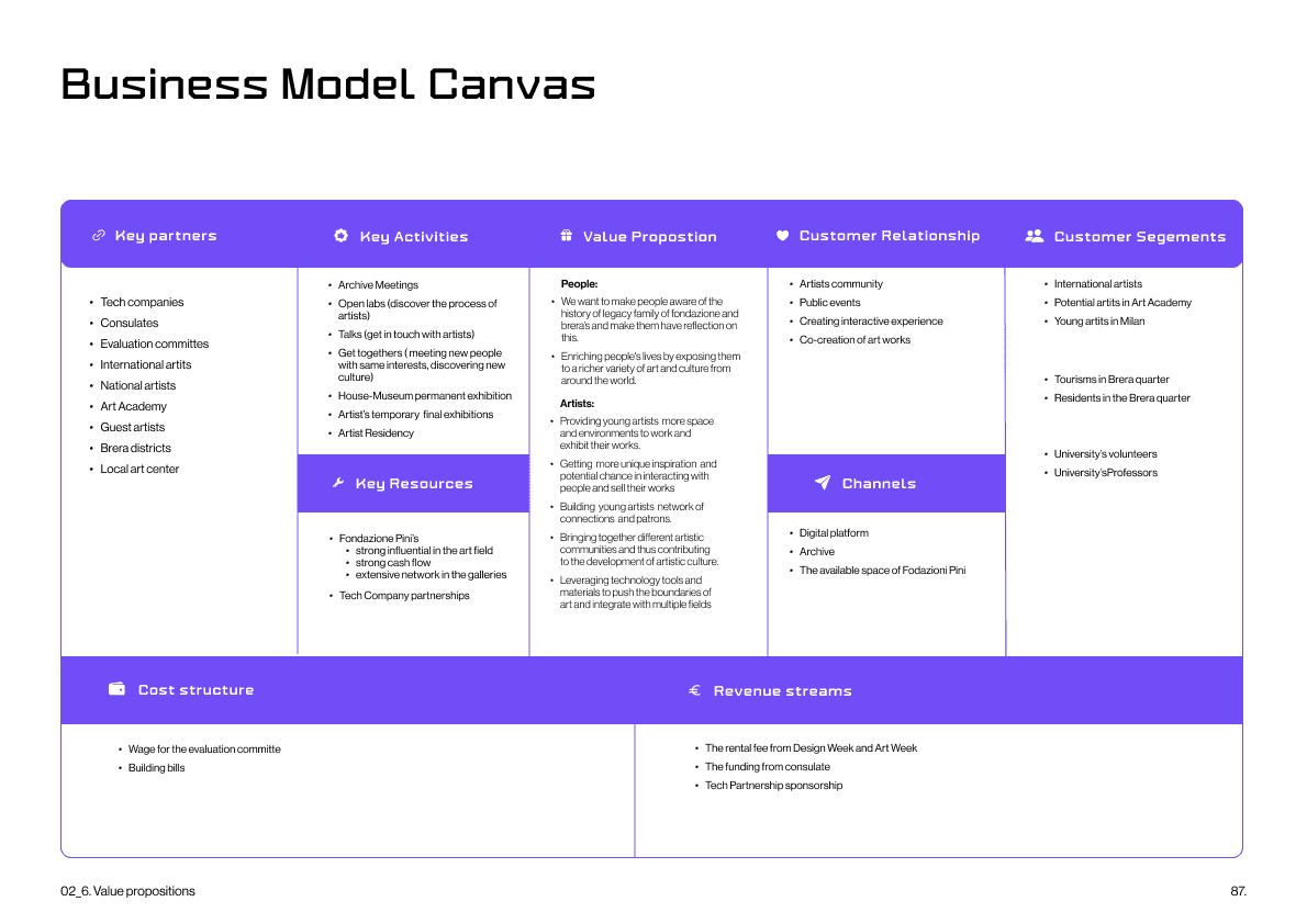 The value delivered by TECHNĒ lies in its ability to offer a fresh vision for Fondazione Pini, opening it to new opportunities through a well-structured and organized service project. By bridging the gap between art and technology, it fosters collaboration with tech companies, giving artists innovative tools to explore and companies fresh perspectives and visibility. This interdisciplinary approach promotes mutual growth, positioning the Foundation within a forward-thinking, creative landscape.