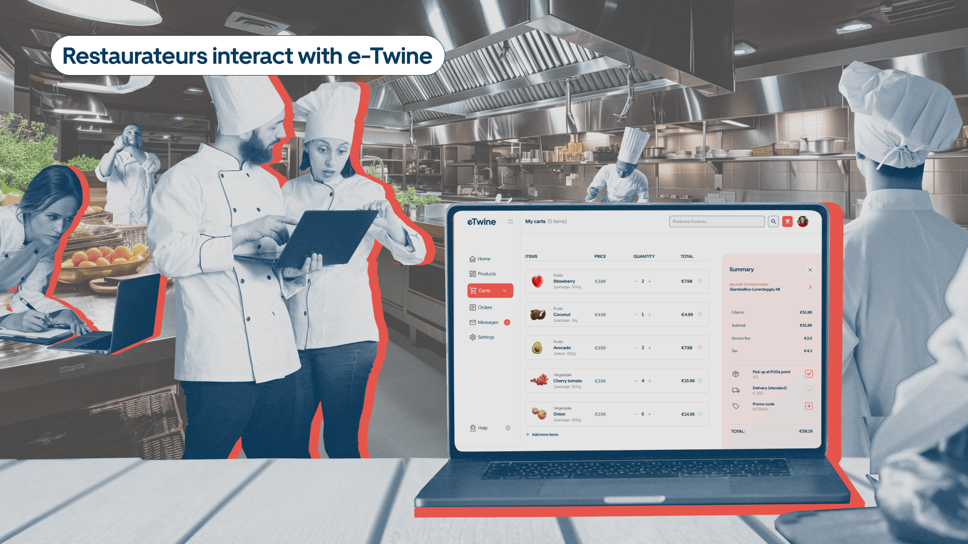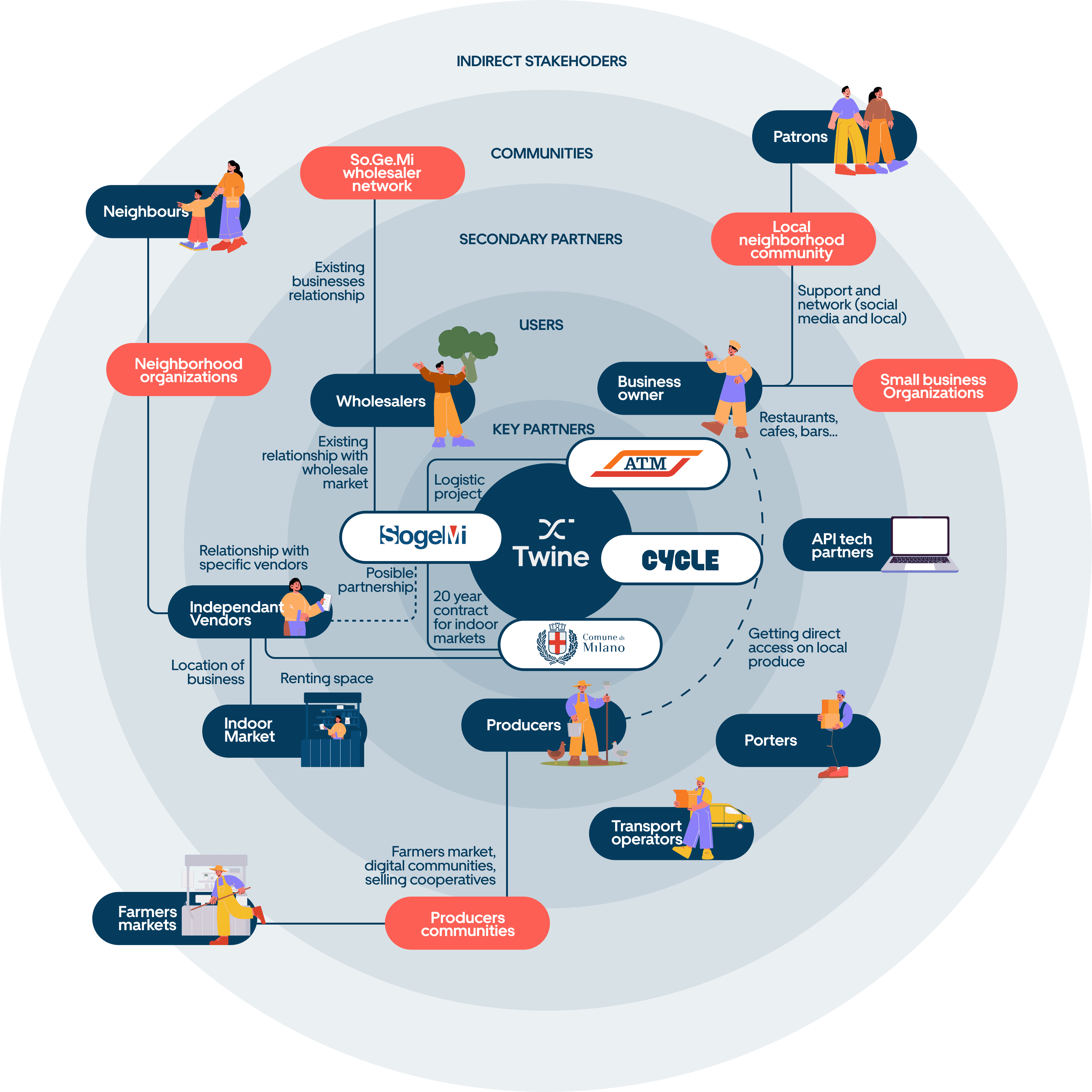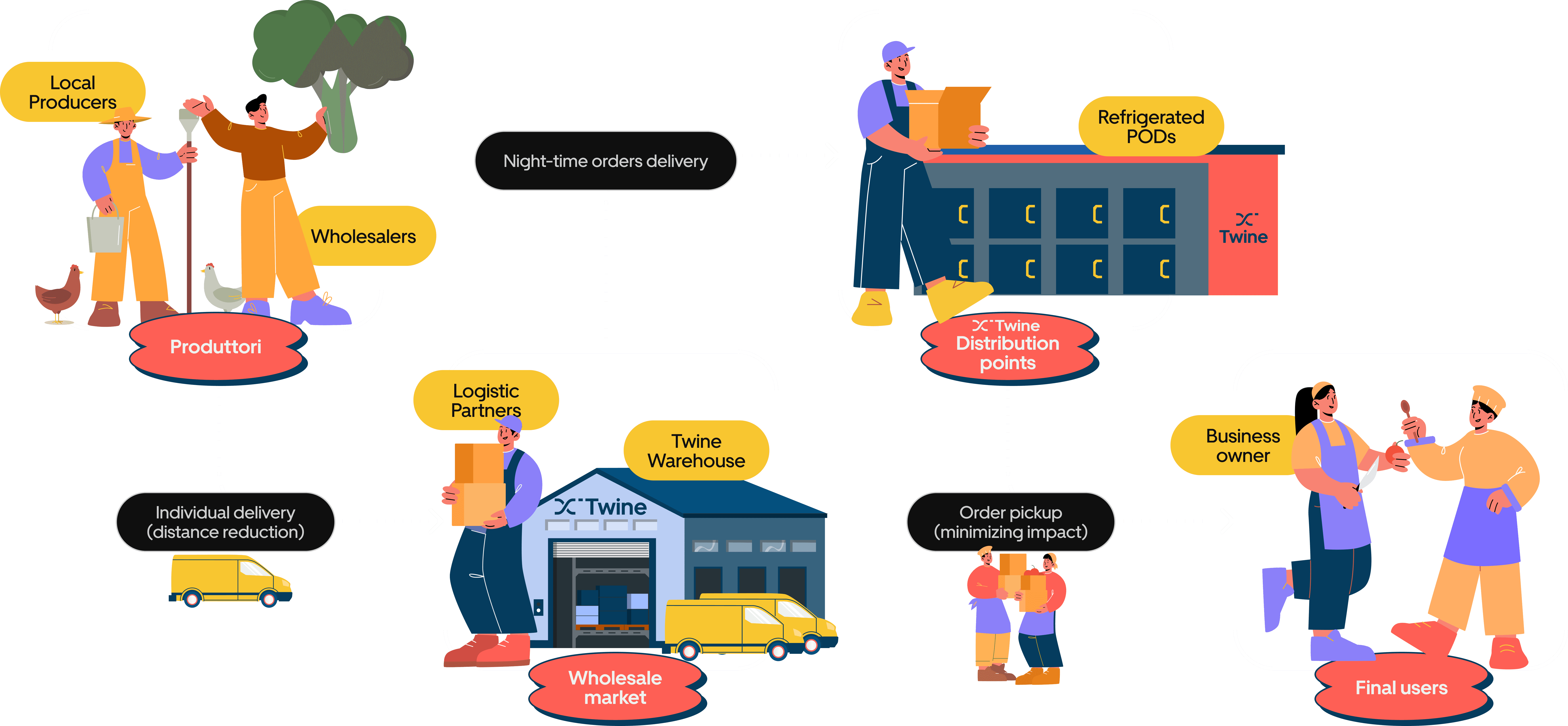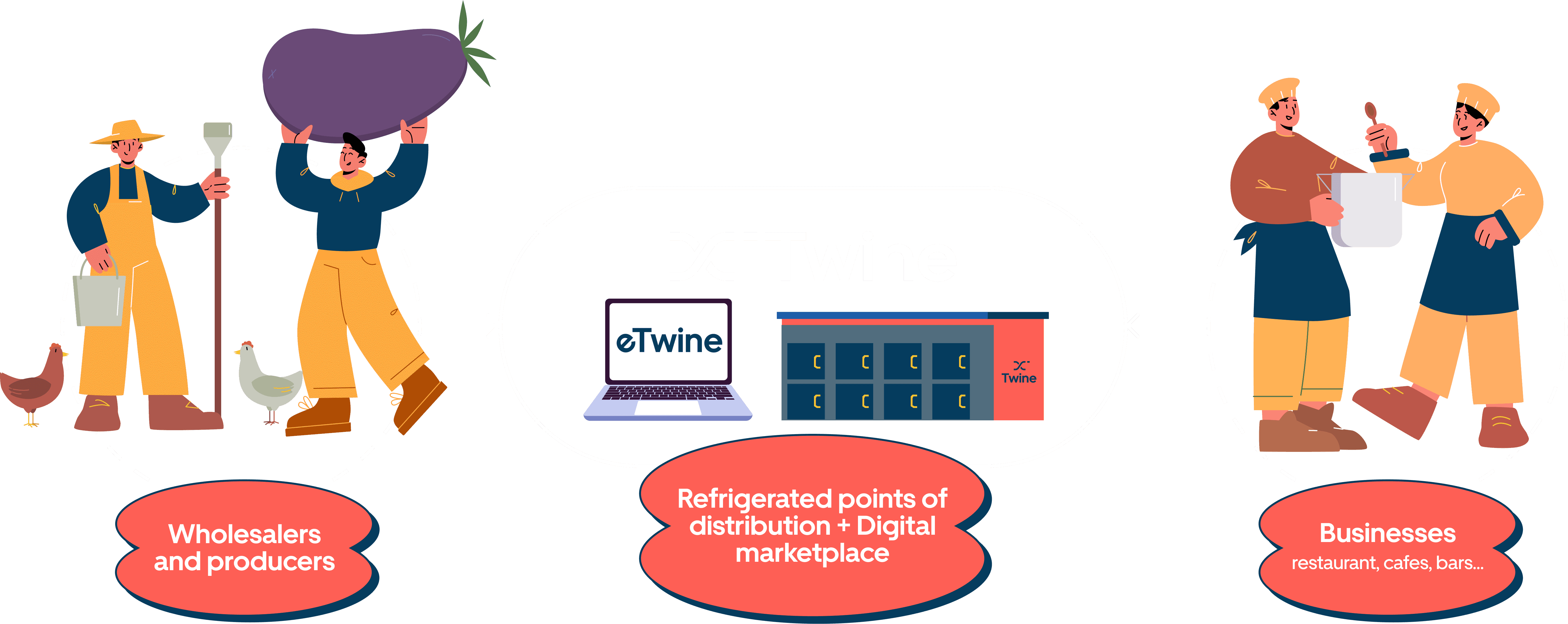 The solution is Twine, a service designed to streamline the supply chain through our intermediary Points of Distribution (PODs) and a new digital marketplace. This approach creates a more efficient network among local producers, wholesalers, and business owners, optimizing the ordering and distribution process.